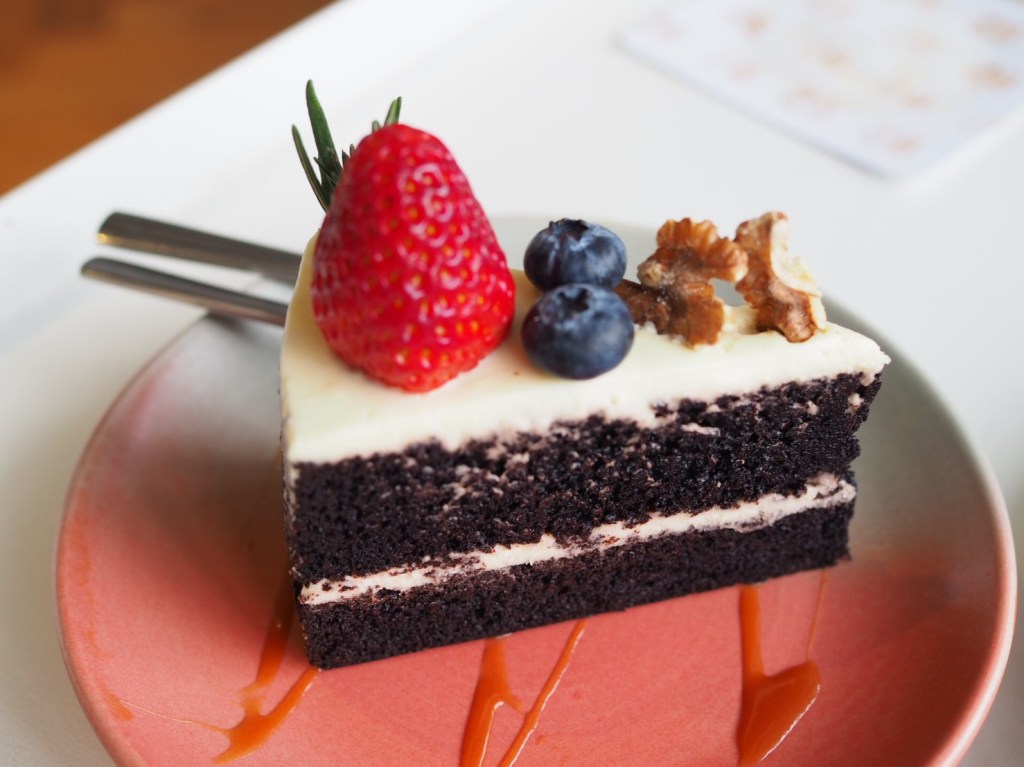 เมนูเค้กก็สนนราคาตั้งแต่ 135 – 160 บาท ที่สั่งมาวันนี้ สารภาพเลยว่าเลือกจากความสวยของเค้ก ฮ่าๆ เค้กดาร์คช้อคแลตเบียร์เบลเยี่ยม และเค้กอัญชัญมูสเลมอน รสชาติ คือดีย์จริงๆค่ะ