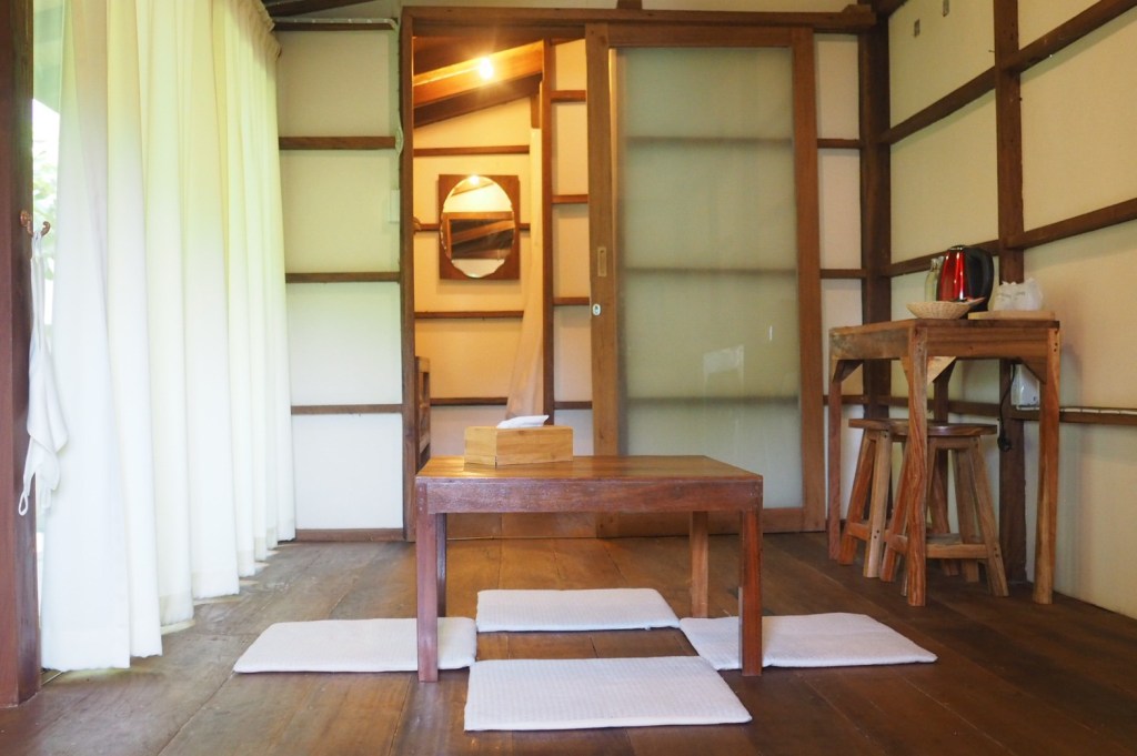 ภายในห้องจัด Lay out ห้องเป็นรูป L Shape ตกแต่งด้วยวัสดุไม้ดูสบายตา ให้ความรู้สึกเหมือนพักผ่อนอยู่บ้าน ตกแต่งแบบพื้นต่างระดับ วางฟูกเรียบง่ายแบบสไตล์ญี่ปุ่น ถัดกันใกล้ๆเป็นโต๊ะไม้ญี่ปุ่น พร้อมเบาะรองนั่งไว้ให้เอกเขนก ส่วนโซนของห้องน้ำ มีการแบ่งพื้นที่เปียกและพื้นที่แห้งอย่างชัดเจน ตกแต่งด้วยผ้าม่านสีขาว ของใช้อำนวยความสะดวกมีให้ครบครัน
