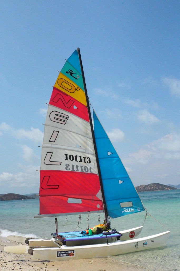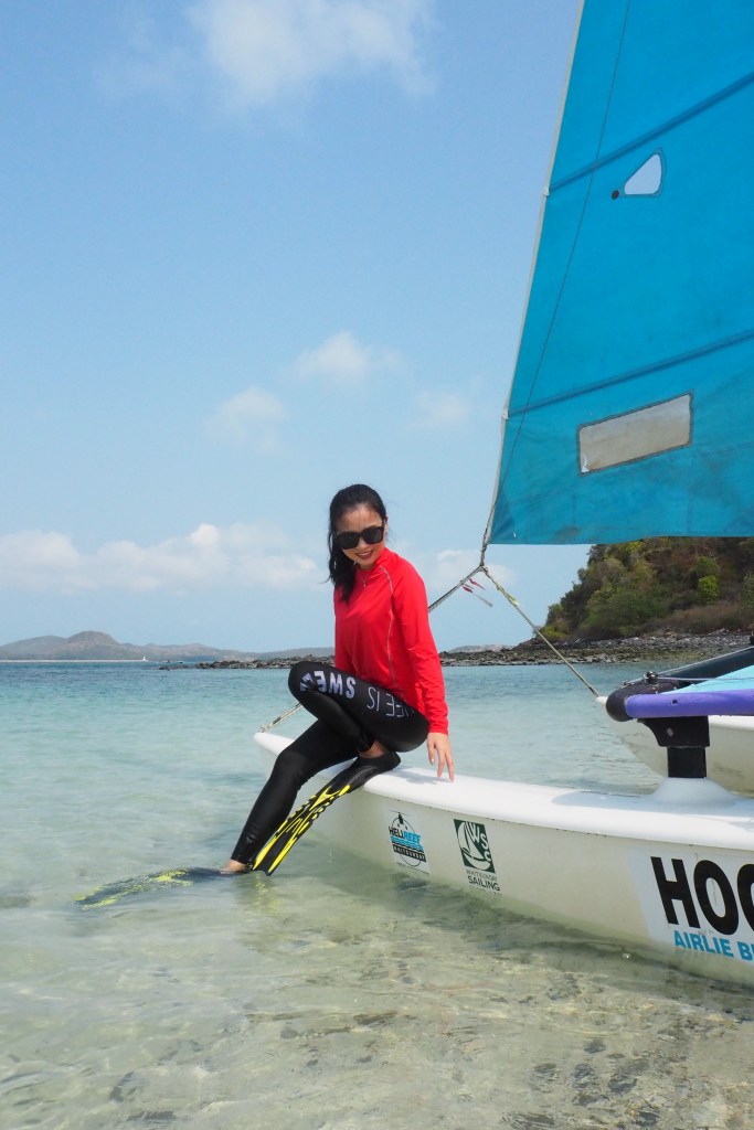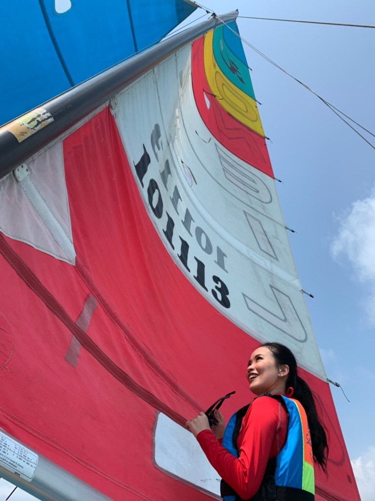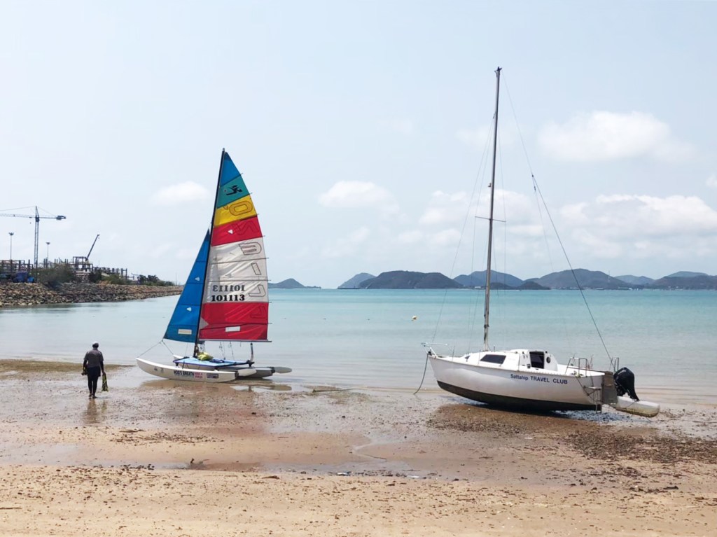 เรือที่จะพาเราไม่ล่องวันนี้เรียกกันว่า Hobbie Cat จะเป็นเรือใบลำใหญ่ มีใบเรือ 2 ใบ ต่างจากเรือใบอื่นๆ และสีใบเรือจะสดใส สีสันเหมาะกับการถ่ายรูปมากๆ โดยจะพาเราไปทำกิจกรรม เรียนขับเรือใบ ดำน้ำแบบสน้อคเกิ้ล ดูเรือรบหลวงจักรนฤเบศ ในมุมที่เราอยู่กลางทะเล สวยไปอีกแบบค่ะ พร้อมกันแล้วมุ่งหน้าสู่ริมหาด เรือใบจอดรอเราอยู่พร้อมครูเรียบร้อยแล้วค่ะ