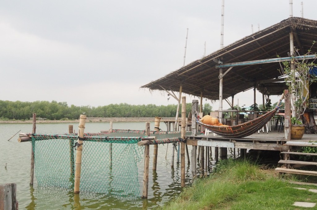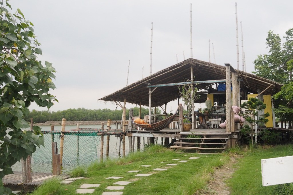 เป็นคาเฟ่บ้านไม้สุดฮิปยื่นไปในน้ำ วิวป่าชายเลน มานั่งห้อยขามองพระอาทิตย์ตกตอนเย็น คือ ฟินมากๆ แถมมีมุมถ่ายรูปสวยอีกหลายมุม เดินรอบร้านสวยทุกมุม มีทั้งสวนดอกไม้ดอกหญ้า ทั้งเปล ทั้งชิงช้าริมน้ำ และไฮไลท์ที่สุดก็คือสะพานไม้ไผ่ที่ทอดยาวออกไปเหนือผิวน้ำ ถ้ามาช่วงฤดูหนาว ก็จะมีนกนางนวลมาบินโฉบไปมาให้รูปสวยเพิ่มเข้าไปอีก