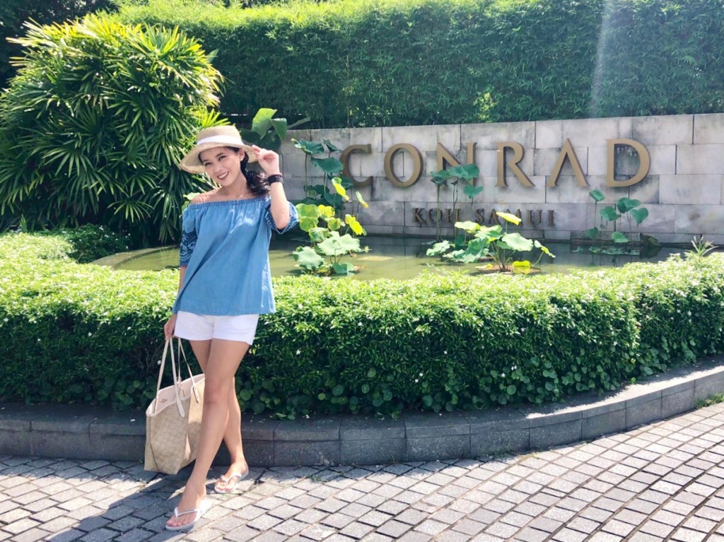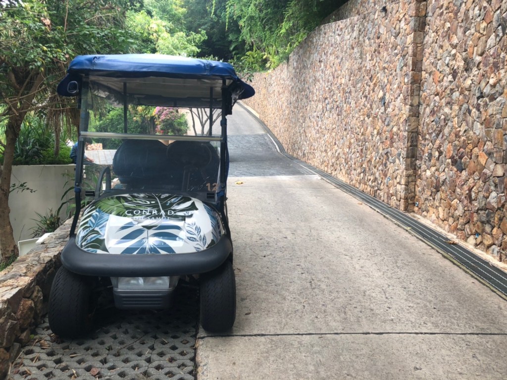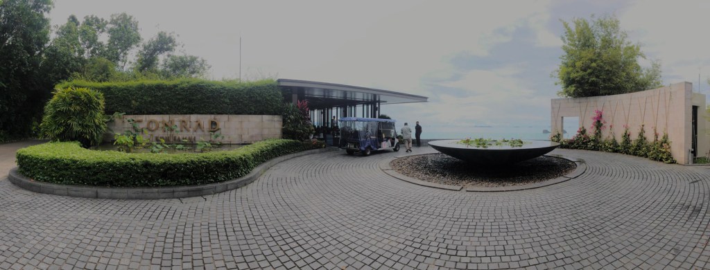 การเดินทางจากสนามบินไปยัง คอนราด ใช้เวลาประมาณ 1 ชั่วโมง เนื่องจากตัวโรงแรมคอนราดอยู่บนเขาอีกฟากนึงของเกาะ โดยห้องพักจะเรียงลงมาตามสันเขา บริเวณลอบบี้จะอยู่จุดสูงสุดของเขา นั่งรถชมวิวมาเพลินๆ เมื่อได้ความรู้สึกว่ารถกำลังเริ่มไต่เขา ก็จอดถึงด้านหน้าโรงแรมเรียบร้อย รีสอร์ทจะหันหน้าออกไปยังทะเล