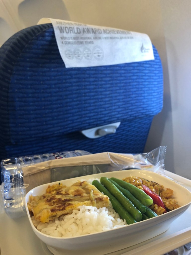 เดินทางเพียง 45 นาทีเอ๊ง ใช้เวลาสั้นมากๆ แต่สายการบินก็ยังคงเสริฟอาหารให้เราอิ่มเอมกันไปก่อนเครื่องลงจอดยังท่าอากาศยานนานาชาติสมุย เมนูวันนี้เป็นข้าวหมกไก่จ้า เสริฟร้อนๆ ก็โอเคอยู่น๊าาา