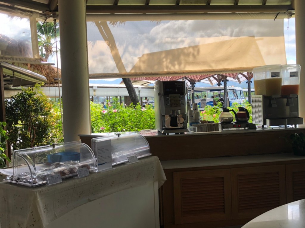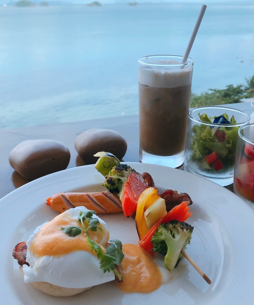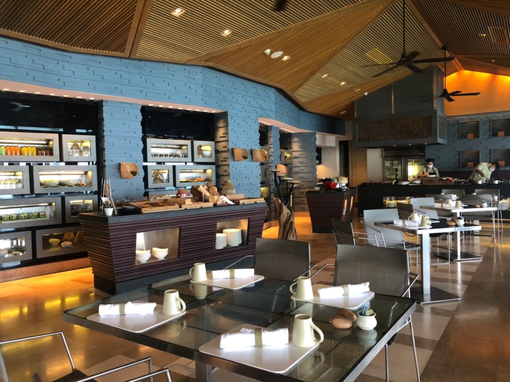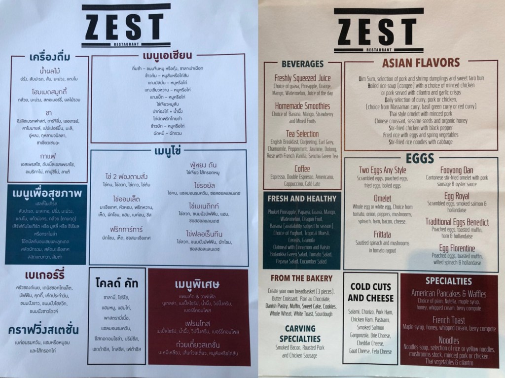 สำหรับมื้อเช้าเราจะออเดอร์มาเสริฟที่ห้อง หรือ ไปทานที่ห้องอาหารเช้าก็ได้ เพียงโทรเรียกรถบักกี้มารับไปส่งที่ห้องอาหาร Zest Restaurant เปิดบริการตั้งแต่ 07:00 – 10:30 น. ค่ะ