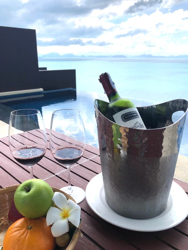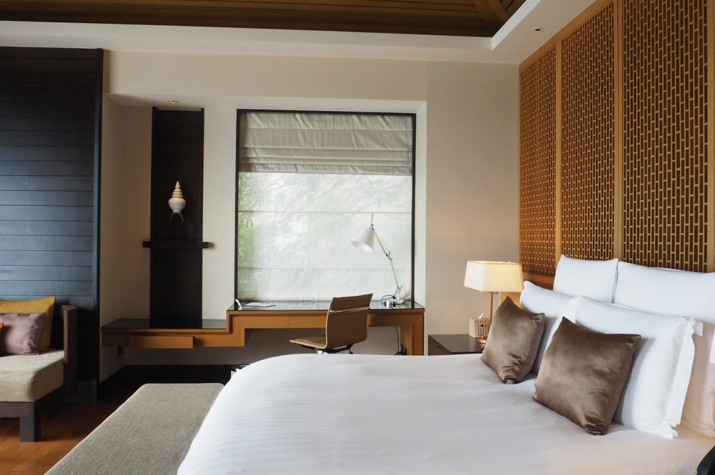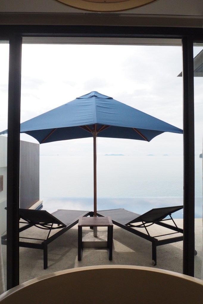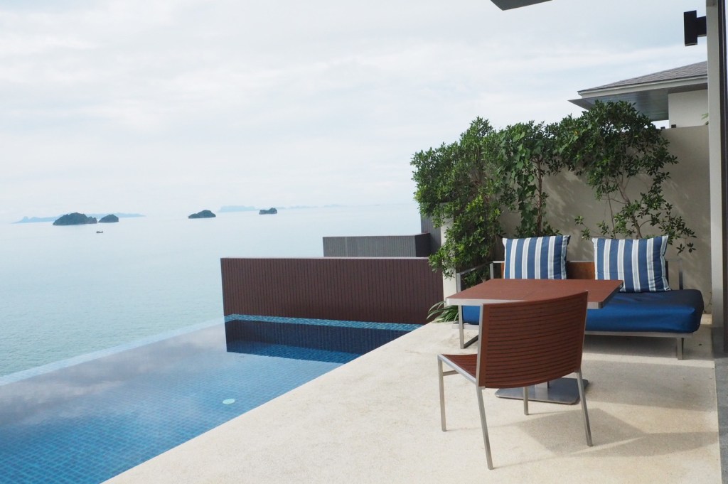 บรรยากาศในห้อง แบบ “Ocean view pool villa” ห้องพักค่อนข้างใหญ่มาก ทั้งโซนห้องนอน และในห้องน้ำ ตรงระเบียง มีสระว่ายน้ำส่วนตัวให้สามารถว่ายไปชมวิวไป ชมพระอาทิตย์ตกดินไป ทีวีสามารถต่อเชื่อมซิงค์กับ อุปกรณ์ของแอปเปิ้ลได้ และมีอินเตอร์เน็ตใช้ได้ทั่วทั้งโรงแรม