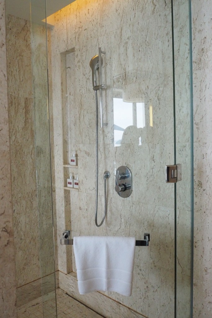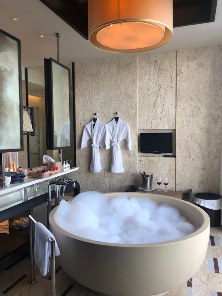ห้องน้ำเป็นหินอ่อนให้ความหรูหรา มีกระจกเปิดกว้างมองเห็นวิวทะเลขณะที่นอนแช่อ่างชมพระอาทิตย์ตกดินได้เลย ฟินสุดๆ