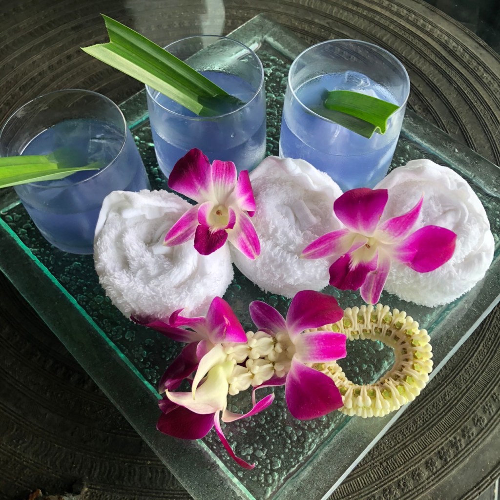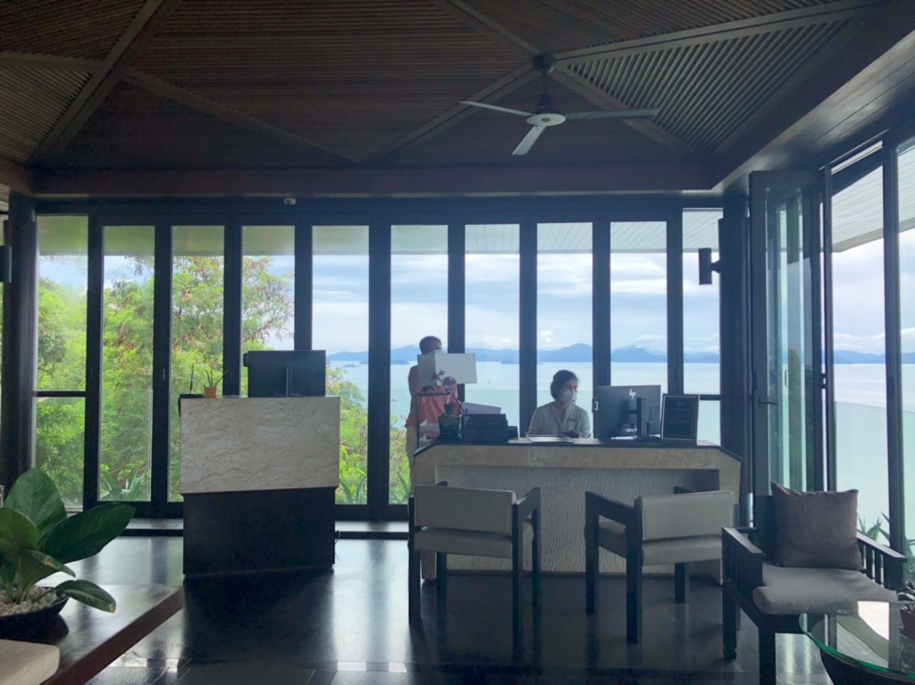 Lobby ไม่ใหญ่มาก เนื่องจากทั้งรีสอร์ทมีทั้งหมดเพียง 80 วิลล่า ขณะที่รอรับ Key Card ก็มี welcome drink พร้อมผ้าเย็นมาให้ นั่งรอพร้อมชมวิวทะเลได้ไปเพลินๆ