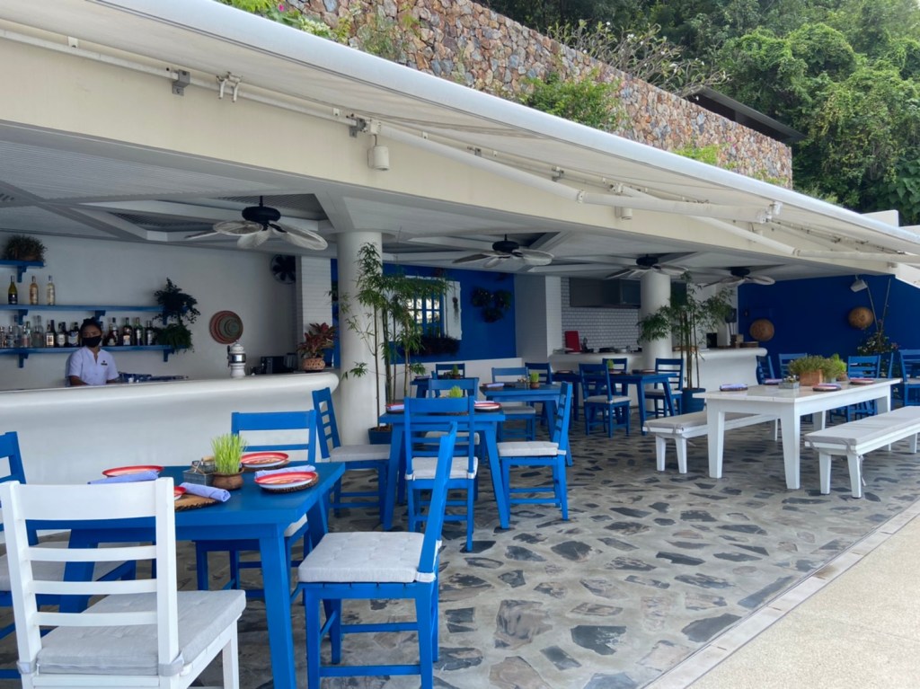ตรงข้างสระว่ายน้ำนี้ มีอีกหนึ่งห้องอาหาร คือห้องอาหาร Azure บรรยากาศดี เชฟแนะนำให้มาทานเป็นมื้อเย็น ชมพระอาทิตย์ตกไปด้วย อิ่มท้องไปด้วย ห้องอาหารตกแต่งโทนฟ้า ขาว อาหารเน้นเป็นแนวสเต๊ก