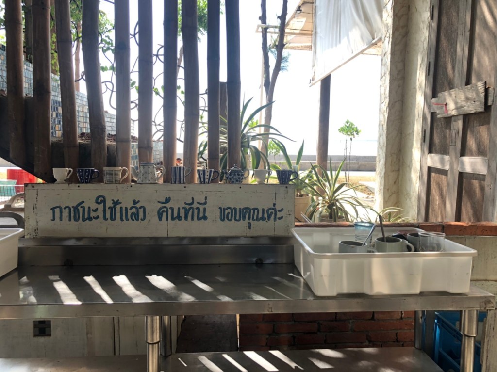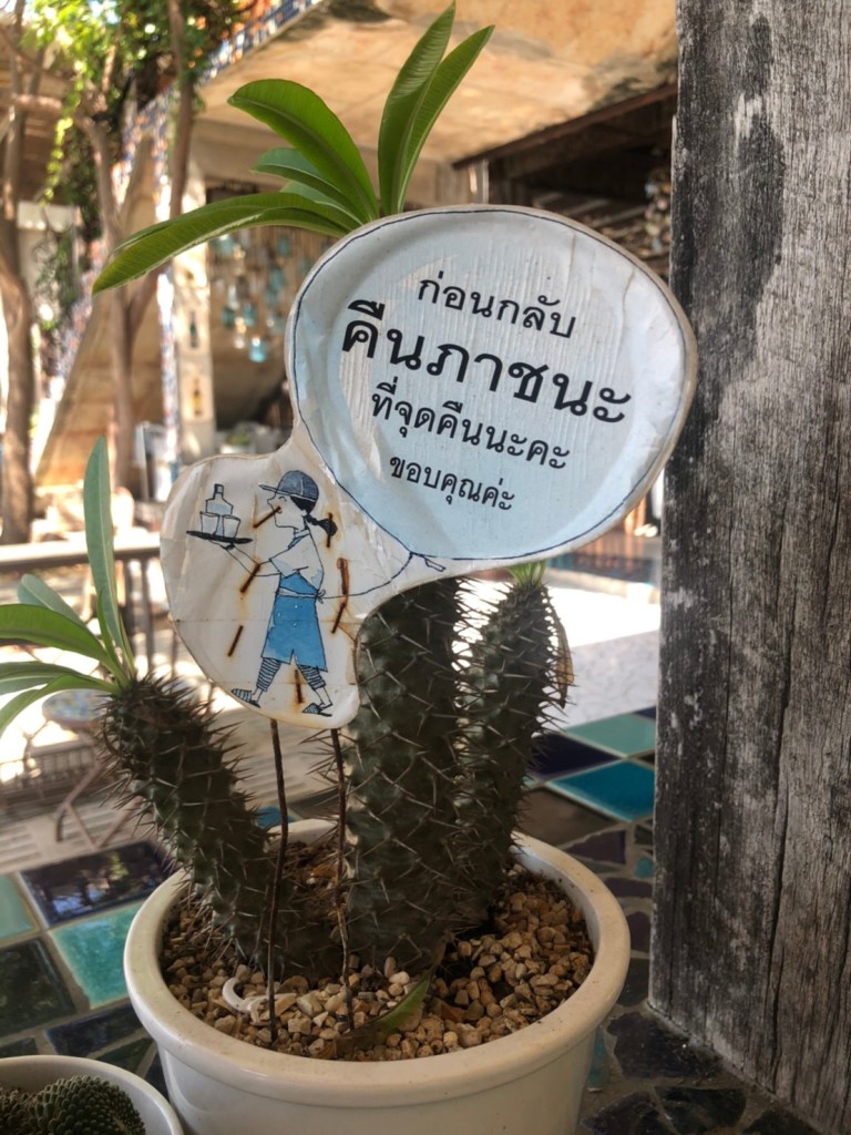 ร้านจะปักป้ายกระดาษไว้ตามจุดต่างๆภายในร้าน “ก่อนกลับคืนภาชนะที่จุดคืนนะคะ” เป็นร้านออกแนวช่วยกันลดโลกร้อนค่ะ และจำนวนพนักงานที่ไม่มากจนเกินไป ก็ขอความร่วมมือประมาณนี้นะคะ