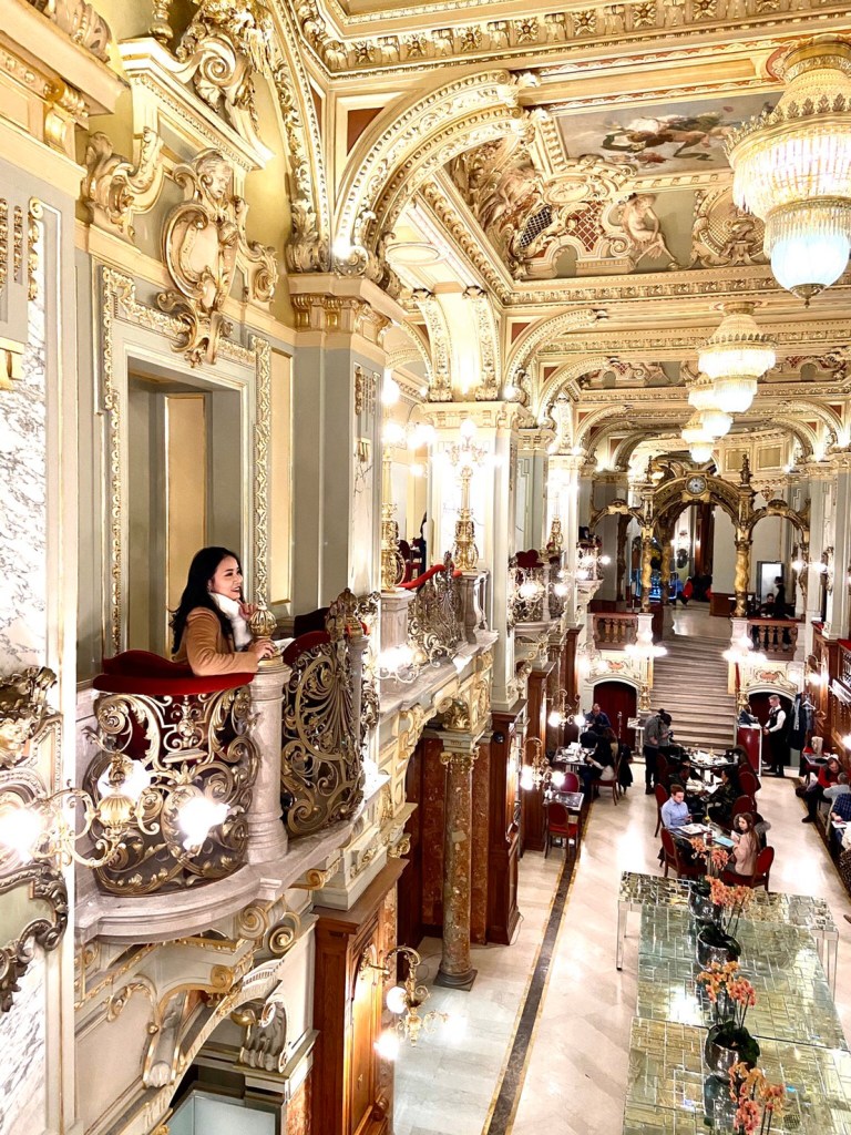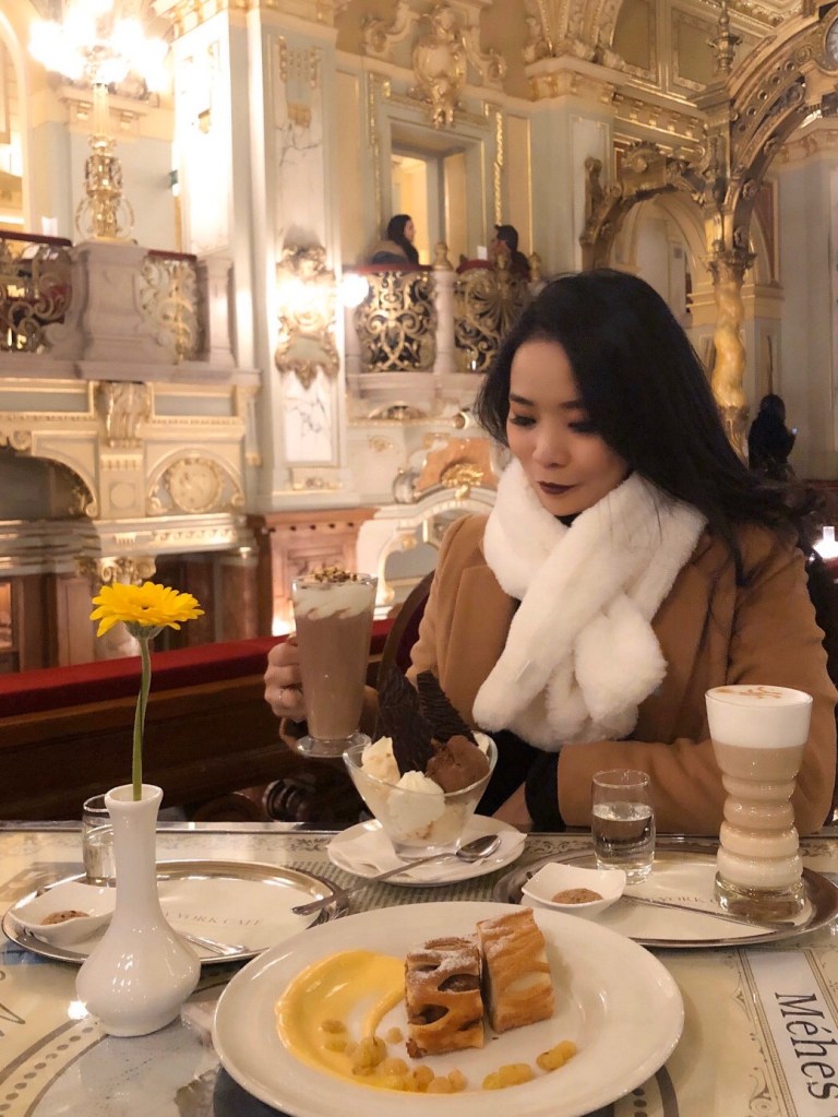 เดินเที่ยวจนได้เวลาที่จองโต๊ะไว้ที่ New York Cafe เรียกว่า อภิมหา “คาเฟ่” สุดอลังการ เป็นคาเฟ่ที่สวยที่สุดในโลก บรรดานักท่องเที่ยวจากทั่วโลกต้องมาเยือน แอบกระซิบว่า ถ้าไม่ได้จองโต๊ะมาล่วงหน้า ไม่มีโอกาสได้ทานแน่ๆ เพราะหางแถวยาวออกไปนอกร้าน แต่เราจองคิวผ่านทางเวปไซต์ของร้านมาตั้งแต่ยังไม่เดินทางค่ะ การเดินทางมาที่คาเฟ่นี้มาโดยรถไฟ ลงสถานี Blaha Lujza Ter