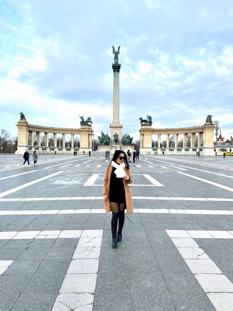 หลังจากนั้นเรานั่งบัสไปเที่ยวต่อที่ Heroes’ Square เป็นลานกว้างๆ มีอนุเสาวรีย์ตั้งตระหง่านอยู่ สูงถึง 36 เมตร และขนาบด้วยรูปปั้นของอดีตกษัตริย์และบุคคลสำคัญ โชคดีที่วันนี้คนน้อย ได้รูปแบบบรรยากาศโดยรอบโอเคแทบจะไม่ติดนักท่องเที่ยวเลย