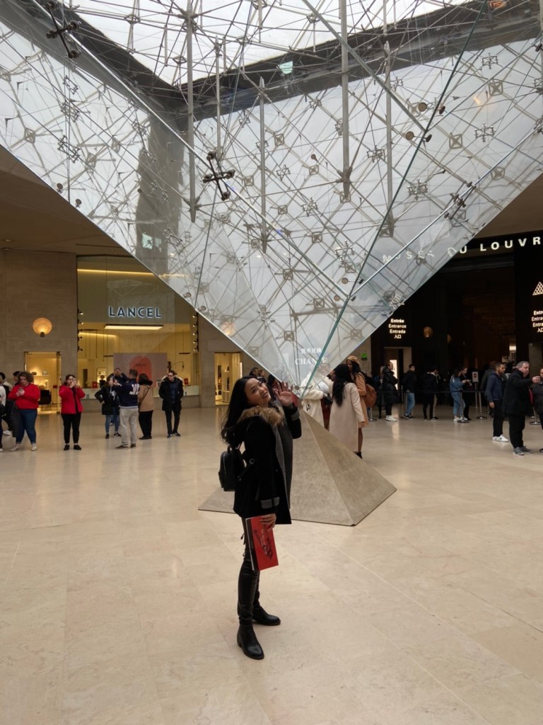 อิ่มท้องแล้วไปเที่ยวกันที่พิพิธภัณฑ์ลูฟร์ (Louvre Museum) กับมุมแลนด์มาร์คของที่นี่ต้องถ่ายกับสามเหลี่ยมปิรามิดแก้วด้านหน้า มีความสูง 20.6 เมตร ฐานรูปมีความยาวด้านละ 35 เมตร ประกอบขึ้นจากกระจกสี่เหลี่ยมขนมเปียกปูน และแผ่นกระจกรูปสามเหลี่ยม รวมทั้งสิ่น 673 แผ่น หากมาแล้วไม่ได้รูปมุมนี้เหมือนมาไม่ถึง