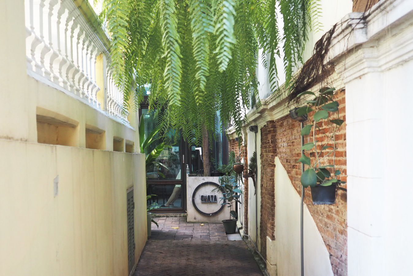 บรรยากาศทางเดินเข้าไปในร้าน เป็นทางเล็กๆ ร่มรื่นไปด้วยต้นไม้นานาชนิด ผสานกับเอกลักษณ์ของร้าน คือ ผนังอิฐ ตัวอาคารทาสีเป็นสีโทนเหลืองอ่อนๆ และสีเขียวไข่กา กลมกลืนไปกับธรรมชาติ