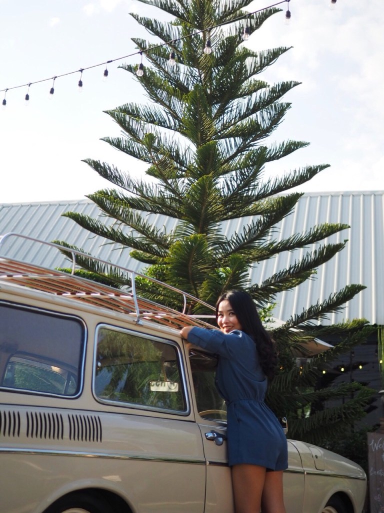 ด้านนอกร้านโซนสวนตกแต่งสไตล์อังกฤษ อารมณ์วินเทจนิดๆ มีรถจอดเป็นพร้อพ พร้อมต้นสนใหญ่ๆ เรียงรายอยู่หลายต้น ให้แชะภาพกัน