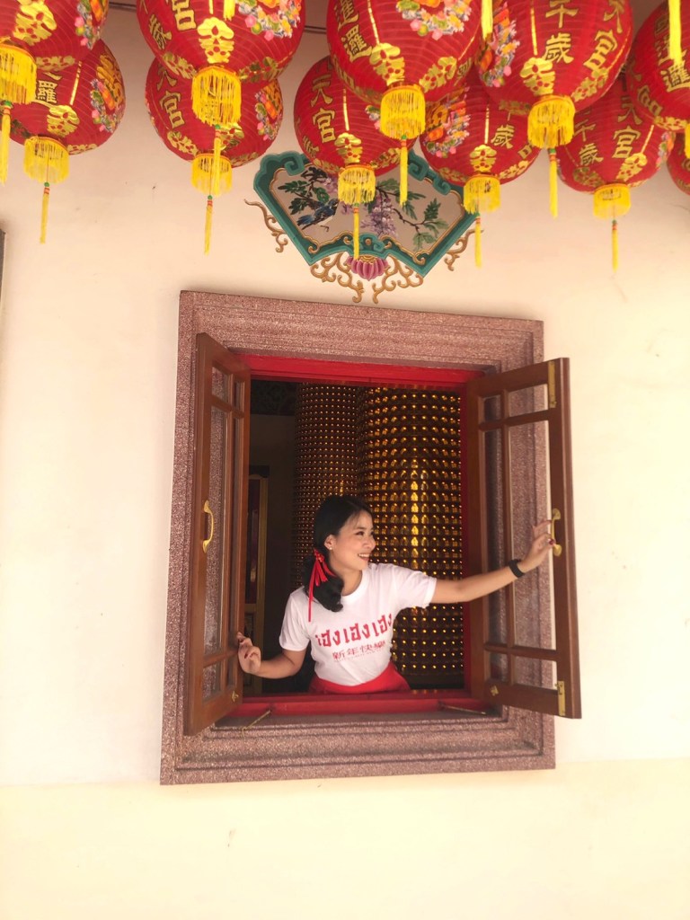 ศาลเจ้าตั้งอยู่ห่างจากเมืองโบราณเพียง 400 เมตร มีที่จอดรถรองรับเยอะมาก เป็นศาลเจ้าที่นักท่องเที่ยวแวะมาชมและถ่ายภาพกันตลอดแทบไม่ขาดสาย วันที่เราไป มีมาถ่ายแฟชั่นแบบชุดจีนฟูลออฟชั่นเลยค่ะ ซึ่งทางศาลเจ้าอนุญาตนะคะ ใครสนใจใส่ชุดจีนมา ก็จัดเต็มไปโลด มีโอกาสแวะมาสักการะกันได้นะคะ