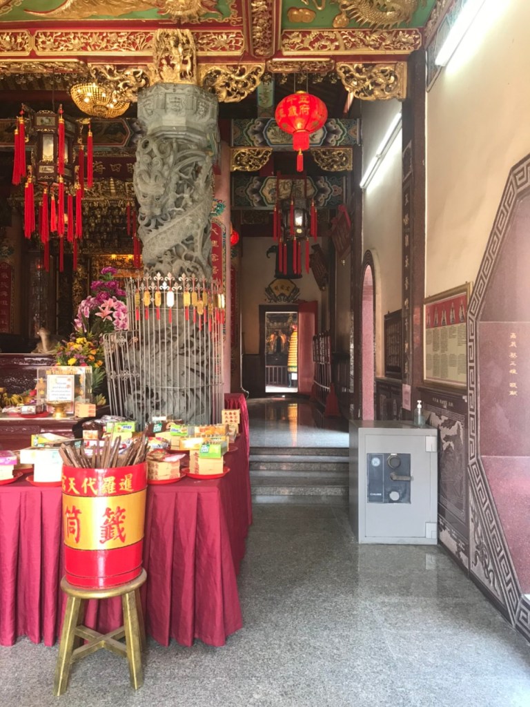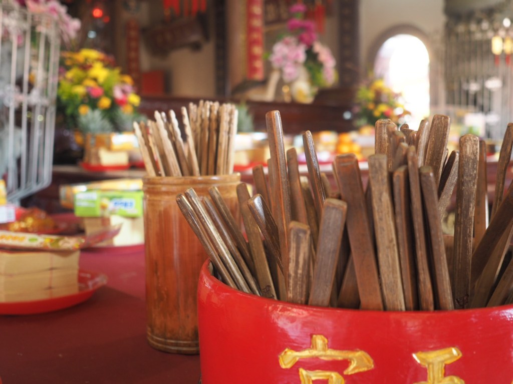ตรงจุดนี้บริเวณด้านบน เหลือบมองขึ้นไปจะเป็นการตกแต่งด้วย ตะเกียงไม้ชุบทองคำตกแต่งอยุ่บนฝ้าเพดาน หลังจากไหว้ขอพรกันแล้ว ผู้คนนิยมเสี่ยงเซียมซีกันด้วยนะคะ