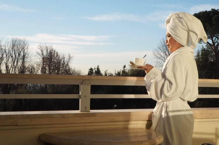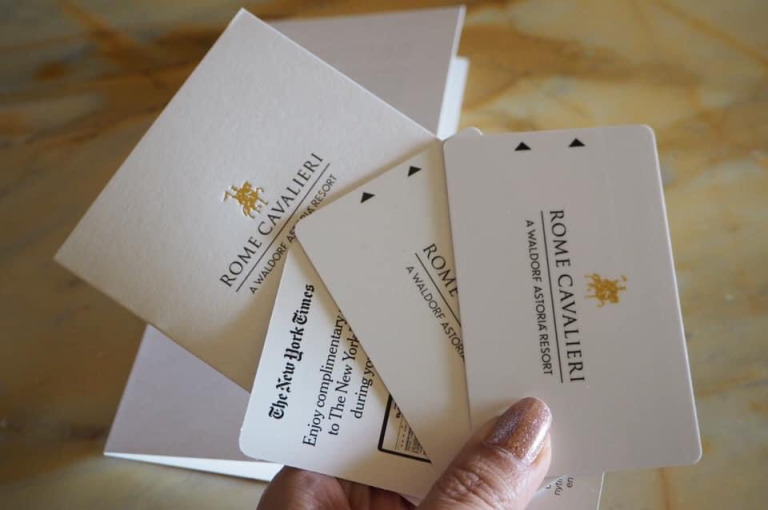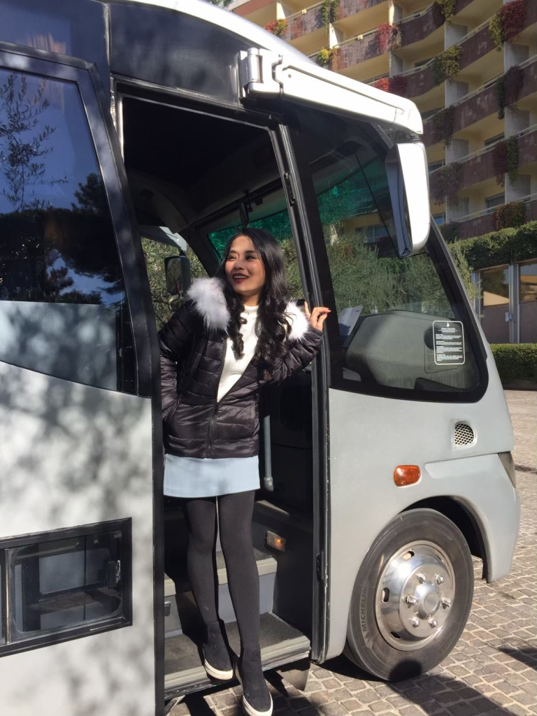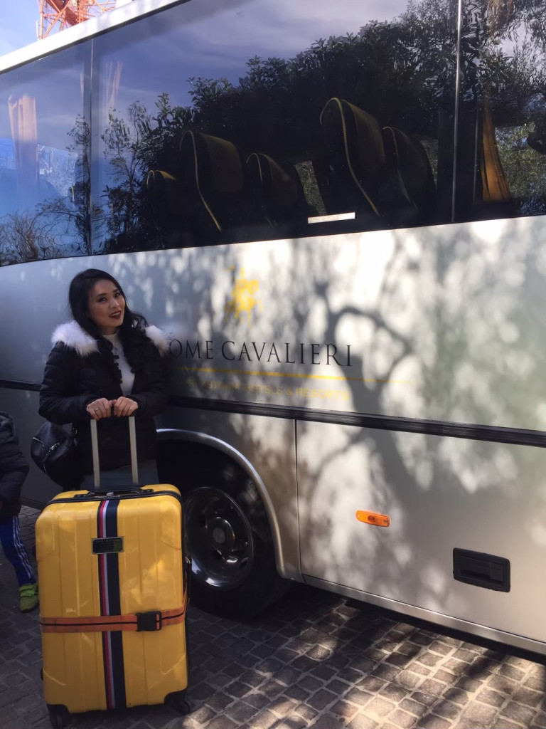 ถึงสถานีรถไฟปุ๊ป ก็รอบัสจากทางโรงแรมที่เราจองไว้ เพื่อไปเช็คอินเข้าที่พัก รอไม่นาน บัสของโรงแรม Rome Cavalieri, A Waldorf Astoria Hotel ก็มารับ และส่งเราลงถึงหน้าลอบบี้เลยค่ะ