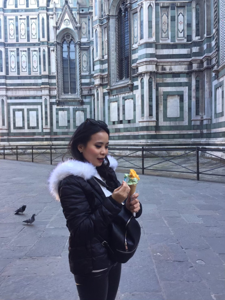 Florence เคยเป็นเมืองศูนย์กลางทางการค้าในสมัยก่อน จัดว่าเป็นเมืองที่รวยเมืองหนึ่งเลยทีเดียว นอกจากนั้นยังเป็นเมืองต้นกำเนิดของยุค Renaissance อีกด้วย มุ่งหน้าไปชมสถาปัตยกรรมความงามของ Piazza del Duomo กันค่ะ แถวนี้ร้านเจลลาโต้เยอะมาก อากาศก็หนาว แต่ก็ยังคงกิน 555+