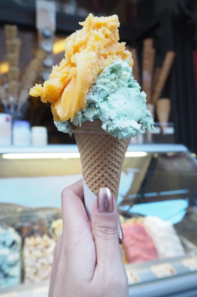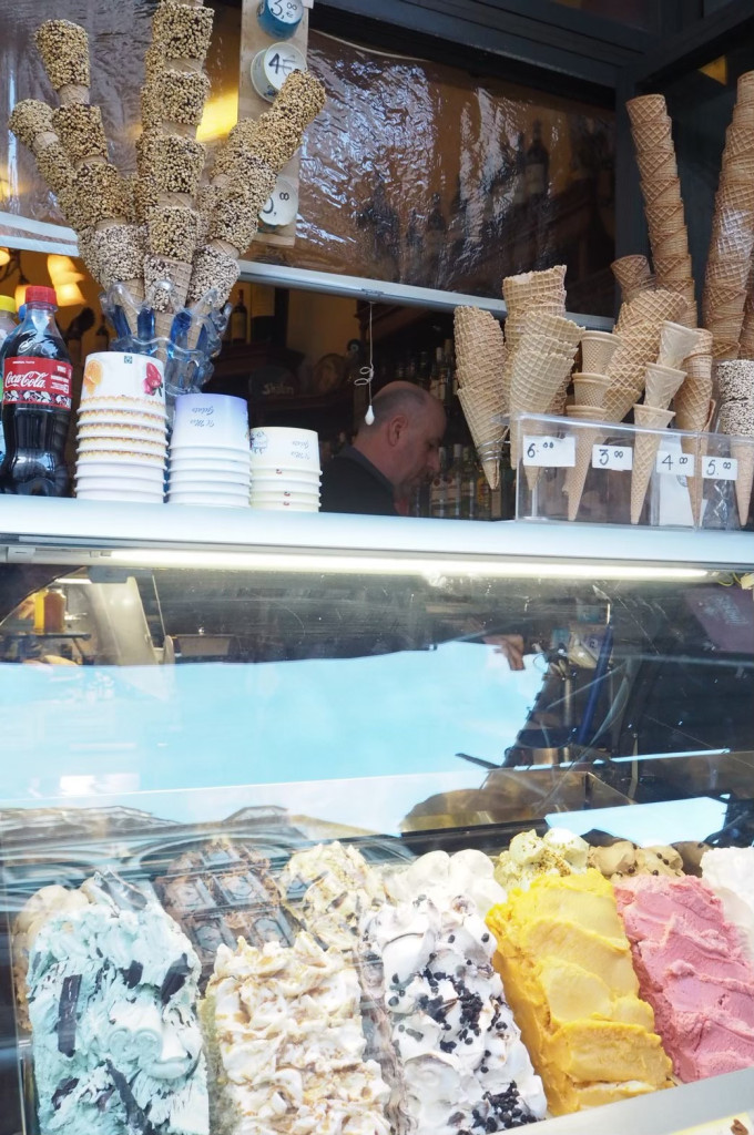 ดูสีสันสิ น่าทานทุกรสชาติ โคนละ 3 ยูโร เลือกได้ 2 รสชาติ ถ้ายังเดินวนเวียนอยู่แถวนี้ จะวนกินให้ครบทุกรสเลย คนขายก็ใจดี ตักให้จนล้นแล้วล้นอีก