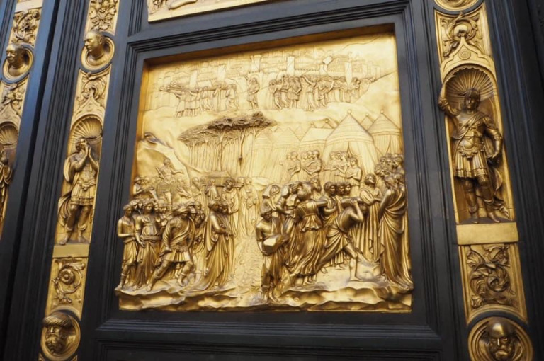 ทางศาสนาคริสต์ที่ด้านในจะมีอ่างน้ำมนต์ที่ใช้ในพิธีศีลจุ่มอยู่ตรงบริเวณประตูค่ะ จึงมีการแข่งขันกันออกแบบประตู และผู้ที่ได้รับชัยชนะในการออกแบบประตูของ Piazza del Duomo คือ Lorenzo Ghiberti โดยใช้เวลาออกแบบทั้งหมด 21 ปี โดยการหล่อ panel ทองสำฤทธิ์ 28 แผ่นประดับที่ประตู โดยเป็นเรื่องราวตาม old testament เช่น stories of Noah, Moses, Solomon, และ the Queen of Sheba