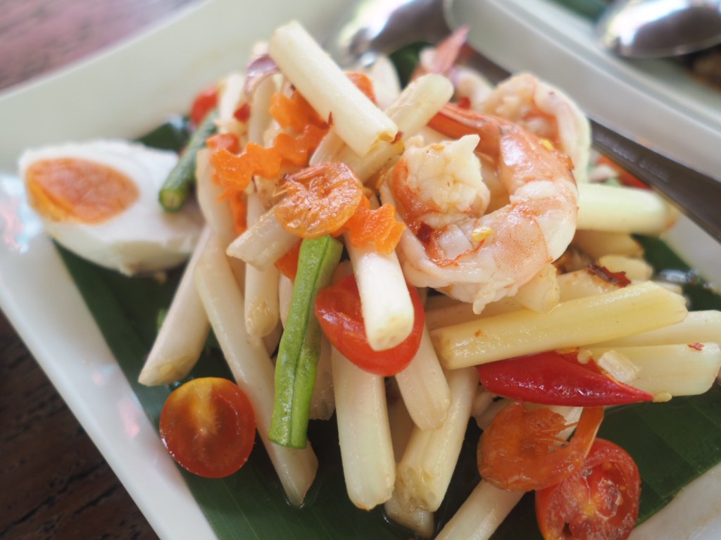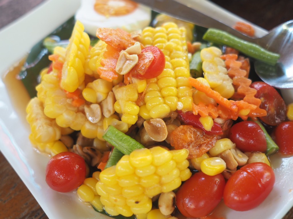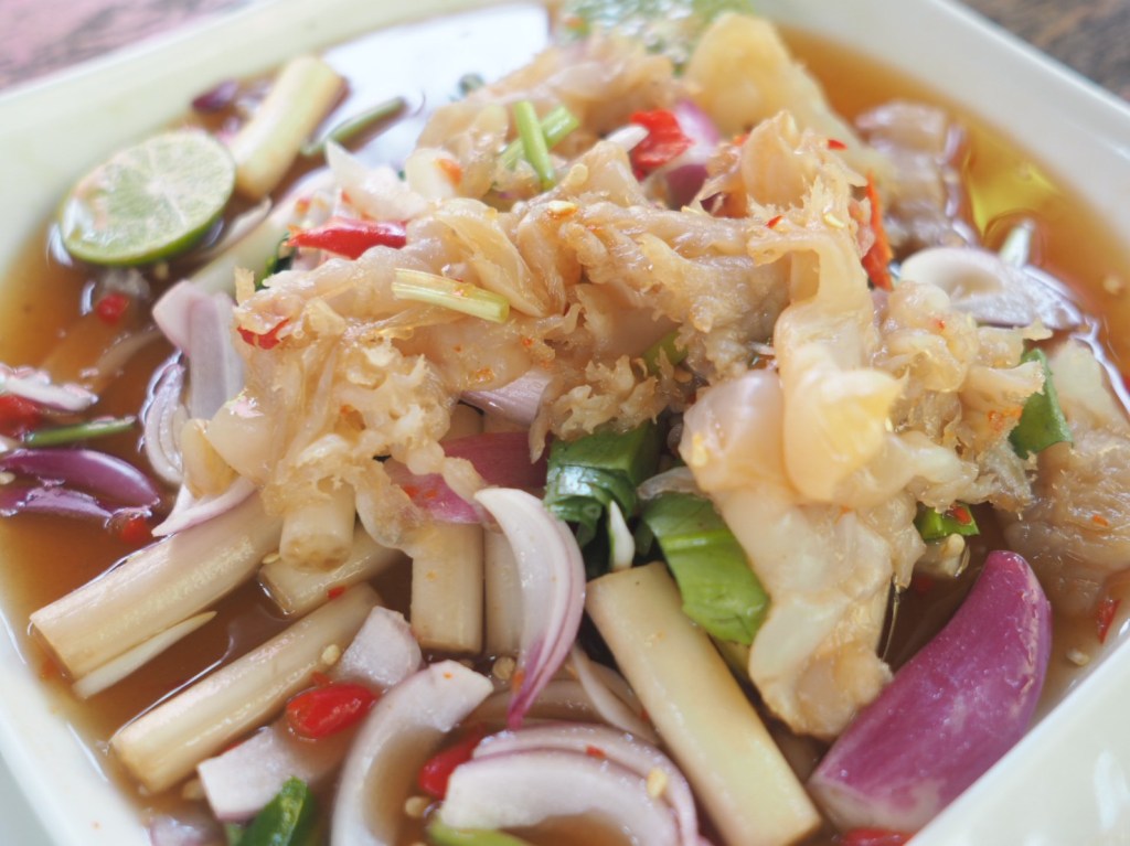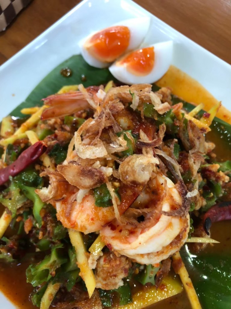 เดี๋ยวจะทานหมูกันเยอะเกินไป ตัดเลี่ยนนิดนึง กับเมนู ยำแมงกระพรุน ( 160 B ) จานนี้ราคาจะสูงนิดนึง แต่แมงกระพรุนสดมากบอกเลย รสชาติจัดจ้านใช้มะนาวแท้ๆ ใส่มาทีครึ่งลูกให้เห็นกันไปเลย และอีกจานเป็นส้มตำข้าวโพดไข่เค็ม ( 80 B ) ข้าวโพดหวานกรอบ เหมือนเพิ่งตัดมาจากไร่อ่ะ กุ้งแห้งตัวเบ้อเริ่ม คุณภาพเกินราคามากจานนี้