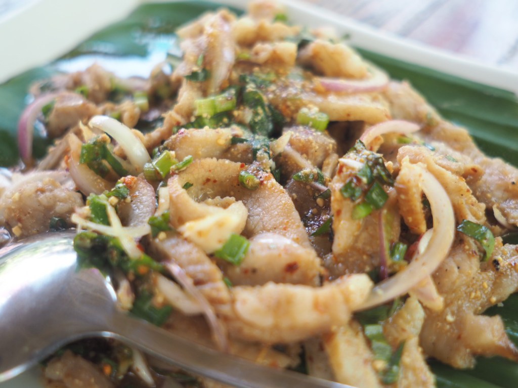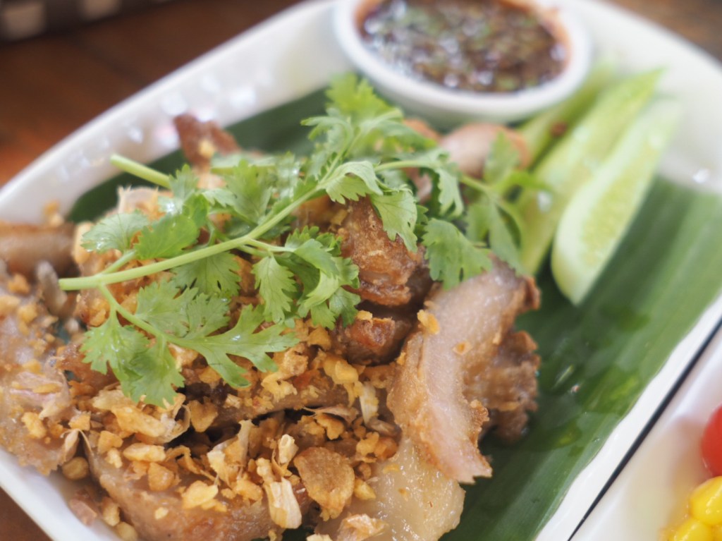 อีกจานที่ไม่สั่งไม่ได้ ถ้ามานครปฐม ต้อง คอหมูทอดจิ้มแจ่ว ( 90 B ) คัดสรรหมูตรงส่วนคอที่ติดมันนิดๆ กรุบกรอบ โรยด้วยกระเทียมเน้นๆ จิ้มกับน้ำจิ้มแจ่วสูตรของทางร้าน ถูกเสริฟอย่างพิถีพิถันบนใบตอง
