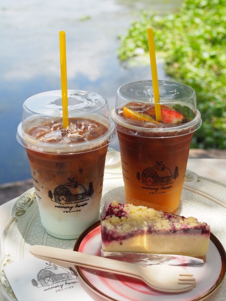 แต่เราคอกาแฟ ก็ขอออเดอร์เมนูกาแฟด้วยละกานค่ะ จัดไปเข้มๆ 2 เมนู กับ มิ้นท์ลาเต้ และ อเมริกาโน่ยูซุ ตัดรสขมด้วยบลูเบอรรี่ชีสเค้กซักชิ้น ยกไปนั่งทานที่ริมน้ำ ลมเย็นๆ แฮปปี้มาก