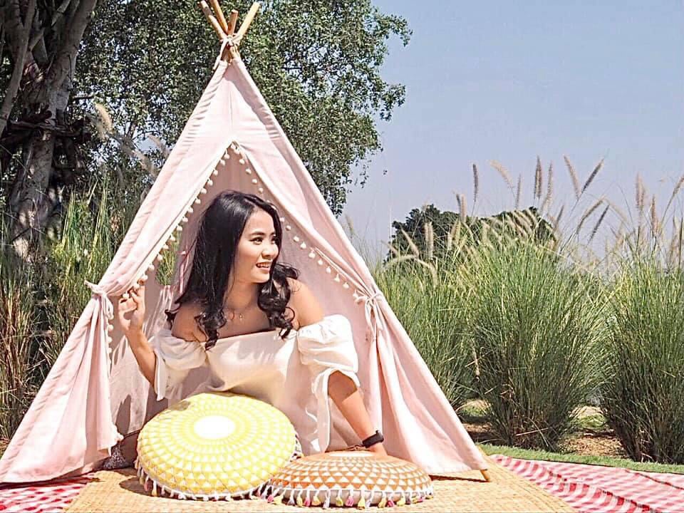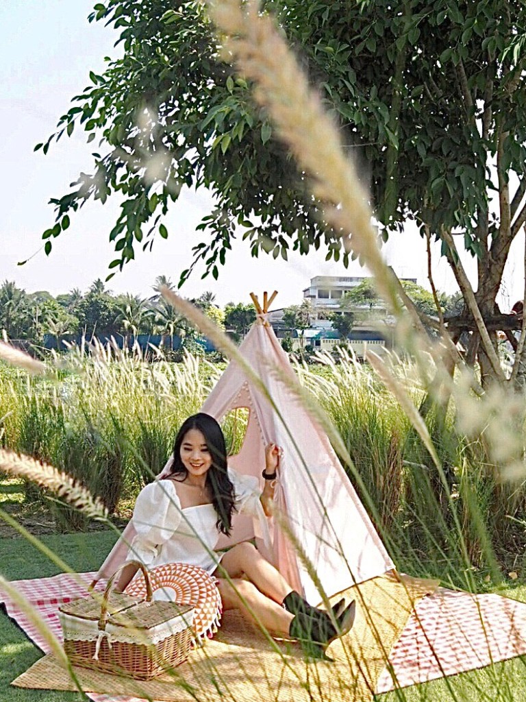 หรือจะมุมนี้เต็นท์กระโจมสุดคิ้วท์ มาพร้อมตะกร้าและหมอนที่ทางร้านเตรียมให้เป็นพร๊อพเก๋ๆ