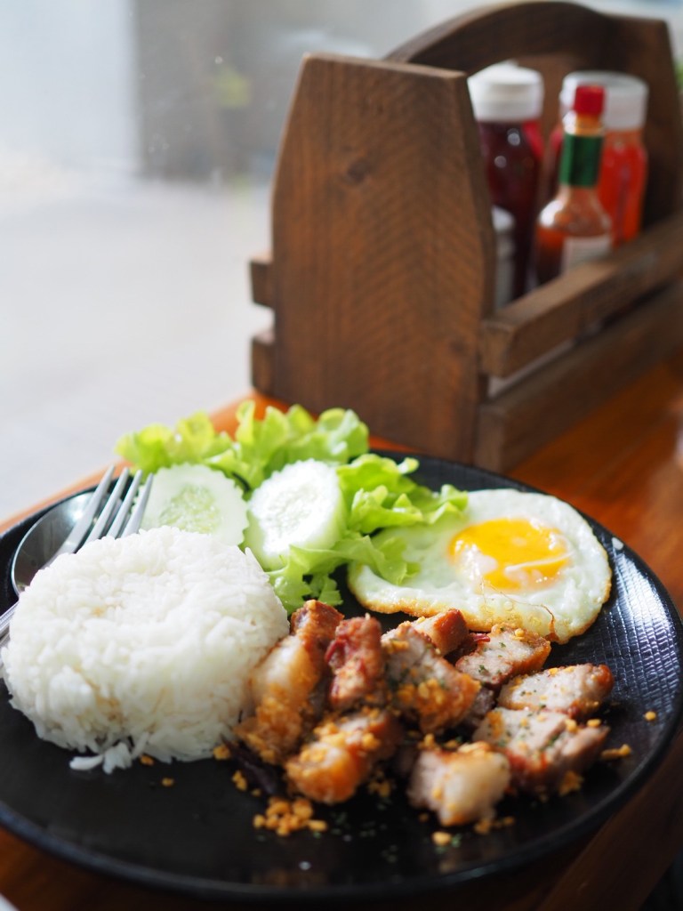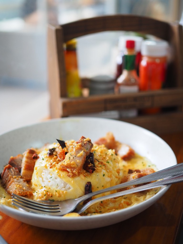 ระหว่างรอขึ้นไปแชะภาพตรงโซนชั้นลอย เริ่มหิว ทางร้านมีเมนูอาหารจานหลักด้วยนะคะ เรียกว่า ครบจบที่ร้านเดียว เน้นเป็นอาหารจานเดี่ยว เรียบง่ายแต่น่าทาน กับเมนู ข้าวหมูกรอบผัดพริกเกลือไข่ดาว (169 บาท) และอีกจาน ข้าวไข่ข้นหมูกรอบพริกเกลือ (169 บาท)