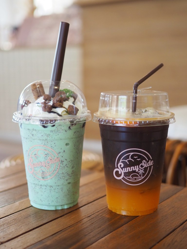 สำหรับเครื่องดื่มและขนม สามารถสั่งได้ที่ตรงโซนนี้ วันนี้จัดไป 2 เมนู SEA Breeze Mint Choc (165 บาท) และอีกแก้ว Orange Americano (145 บาท) ทางร้านยังมีเค้กและครัวซองต์น่าทานอีกหลายเมนู